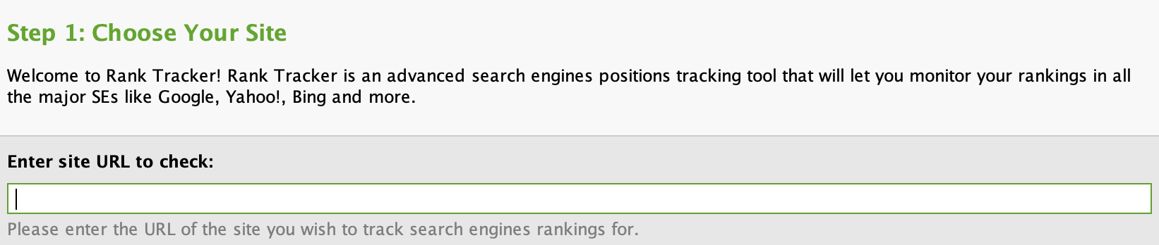 To check your Bing search visibility in SEO Powersuite, first open up the Rank Tracker application of SEO Powersuite and enter your domain.