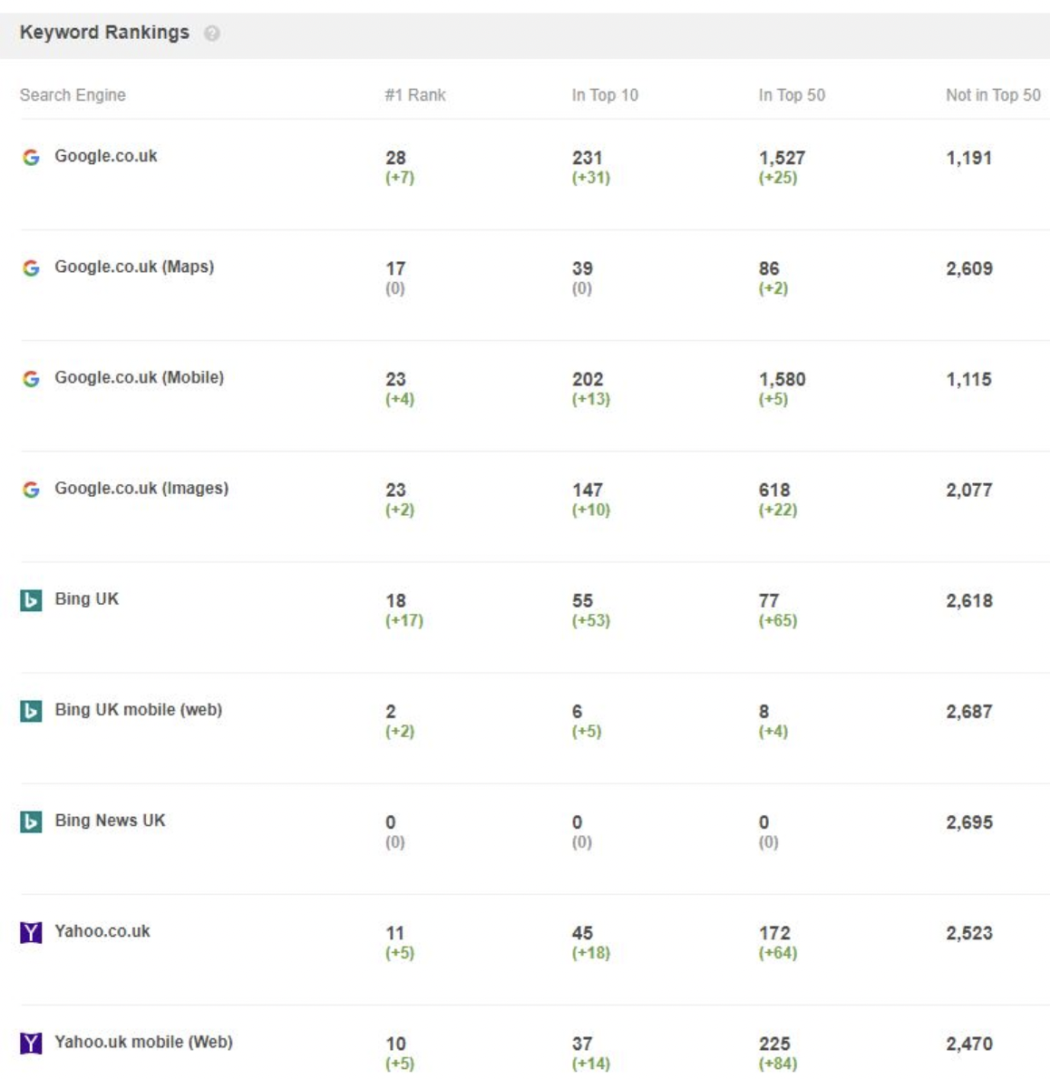 Once Rack Tracker has finished checking your rankings against the various search engines you’ve added, youโll be able to see how your keywords in Bing compare to Google, and if there are any discrepancies.